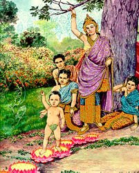 In the morning of the Vesak Full moon day, the Queen left Kapilavastu on a visit to Devadaha. Approaching a lovely park of Salstrees called Lumbini, located between the two capitals but nearer to Devadaha, the Queen wanted to visit the park and when she arrived at a Sal tree she started contractions and gave birth to a son there. When the Kings of Kapilavastu and Devadaha learned this, they were very happy and arranged a procession back to Kapilavastu.