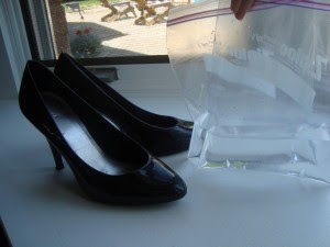 2. นำถุงน้ำยัดใส่เข้าไปในซอกรองเท้า โดยพยายามยัดให้แน่นที่สุดอย่าให้เหลือพื้นที่ว่าง