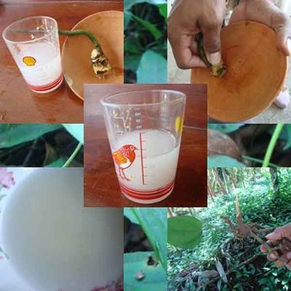 น้ำซาวข้าว 100 มิลลิลิตร หรือ CC เหง้ารางจืด 1 เหง้า และฝาหม้อดิน