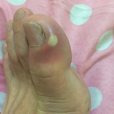 พระเจ้า !! เภสัชกรคงไม่ไหวแล้ว เรารีบไปโรงพยาบาล และคิดว่าคงต้องกรีดเอาหนองออก แค่เอาหนองออกก็คงจะหาย แต่ไม่เป็นแบบนั้น เมื่อเข้าพบหมอ หมอดูอาการอย่างละเอียด ถามว่าเราไปทำอะไรมา เราก็บอกว่าอาทิตย์ที่ผ่านมาก็ตัดเล็บตามปกติทุกอย่าง หมอดูอาการอย่างละเอียด คืออาการหัวหนองมันอยู่ข้าง ๆ เล็บ ดูผิวเผินคือแค่เอาหนองออกคงจบ แต่มันไม่ใช่ หมอพิจารณานิ้วเท้าเราอย่างละเอียด เขาบอกเราว่าต้องถอดเล็บ !! ต้องผ่าตัดถอดเล็บออก !! เพราะถึงแม้หัวหนองไม่ได้อยู่ในเล็บ แต่ต้นตอต้นเหตุคือในซอกเล็บ จากที่เราไปแคะ ไปแงะ ไปตัดอย่างผิดวิธี หรือแคะลึกจนเกินไปจนเกิดการอักเสบ พอเกิดการอักเสบ ตรงซอกเล็บผิวมันเปิด อาการที่เราคิดว่าแค่ปวด ๆ เจ็บ ๆ ใช้ชีวิตประจำวันปกติ เดินผ่านอะไรต่าง ๆ นานา สิ่งสกปรกมันก็เข้าไปตามซอกเล็บ เกิดการสะสมจนกลายเป็นการติดเชื้อ เป็นหนอง ถ้าไม่ถอดออกก็ไม่หาย เล็บอาจเน่า ติดเชื้อรุนแรง และอาจลาม