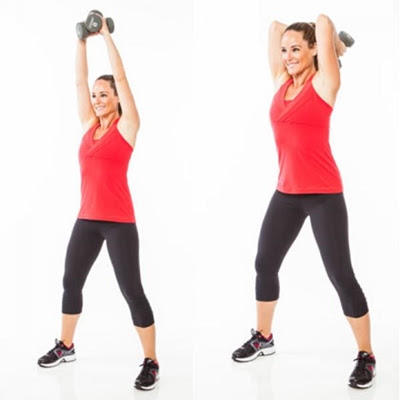 Step 1 : ยืนกางขาให้เท่ากับความกว้างของไหล่ ใช้มือทั้งข้างจับดัมเบลไว้แล้วยกแขนขึ้นเหนือศีรษะ แล้วค่อย ๆ พับแขนไปทางข้างหลังและยกขึ้นใหม่ให้นับ 1