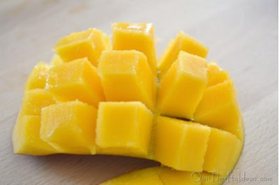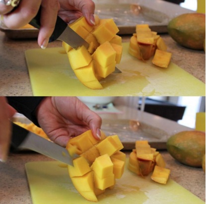 4. ใช้ส้อมหรือมีดตัดมะม่วงออกจากเปลือกเป็นชิ้นๆ เท่าๆ สี่เหลี่ยมลูกเต๋า เสร็จแล้วใส่จานทานได้เลย หรือจะเก็บใส่ถุงแช่ช่องฟรีซเอาไว้ทำสลัดผลไม้ก็ได้เราไม่ว่ากัน