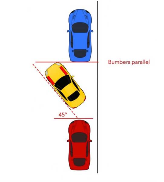 2. ให้หักพวงมาลัยรถเข้าหารถคนสีน้ำเงิน(หมุนเข้าหาฟุตบาท)เอาให้สุดวงเลยนะคะ และขณะเดียวกันก็ค่อยๆถอยรถไปด้วยเล็กน้อย จะทำให้รถของเราทำมุม 45 องศาพอดีคะ ถึงตอนนี้เราจะมองเห็นป้ายทะเบียนขอบรถคันที่อยุ่หลังที่จอด(คันสีแดง)แล้วคะ