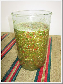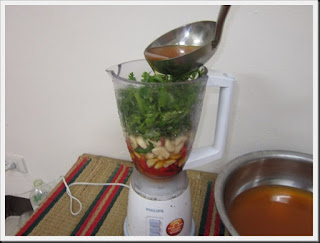 จากนั้นนำส่วนผสมทั้งหมดมาปั่นรวมกันโดยใส่พริก ใส่กระเทียม ใส่ผักชี ลงไปในเครื่องปั่น แล้วใส่น้ำปรุงที่เราเตรียมไว้ลงไปเผื่อให้การปั่นง่ายขึ้น ขึ้นตอนการปั่นแยกปั่นสองครั้ง