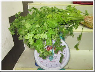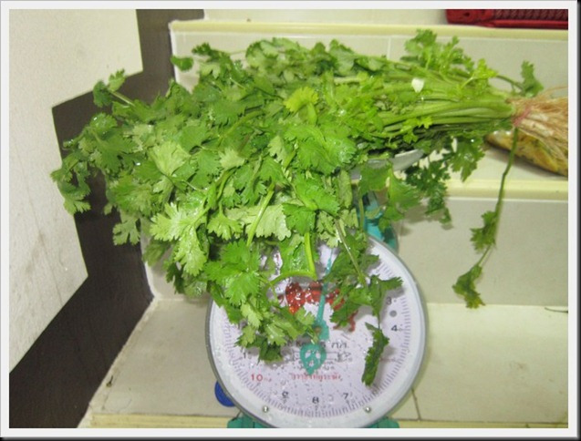 ผักชี 4 ขีด ใช้ทั้งต้น ตั้งแต่รากจนใบ ยกเว้นใบที่เสียก็ให้เด็ดออก