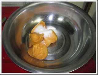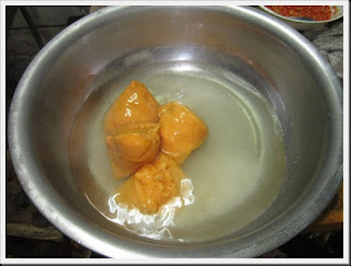 ใส่น้ำร้อนลงไปแล้วก็คนให้เข้ากัน คนจนให้น้ำตาลปี๊บแตกละเอียด