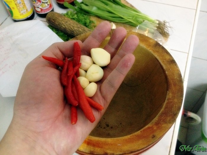8. นำพริกแดง 9 ลูกและกระเทียม 6 กลีบ มาโขลกให้เข้ากันจนแหลกครับ
