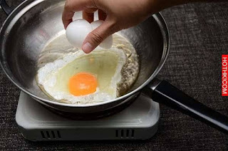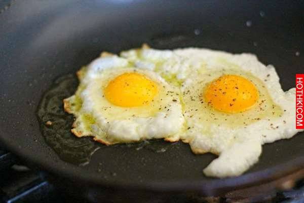 2. ตอกไข่ใส่ลงไปในกระทะ แม้ว่าน้ำมันจะไม่ร้อน แต่เนื่องจากเราตั้งกระทะทิ้งไว้ก่อนหน้านี้ กระทะจึงมีความร้อนสูง ดังนั้นเมื่อตอกไข่ลงไปจึงต้องรีบปรับไฟให้อ่อนลง เพราะถ้าหากว่าเราไม่รีบเบาไฟให้อ่อนลง จะทำให้ไข่ขาวไหม้เร็วแต่ ไข่แดงไม่สุก