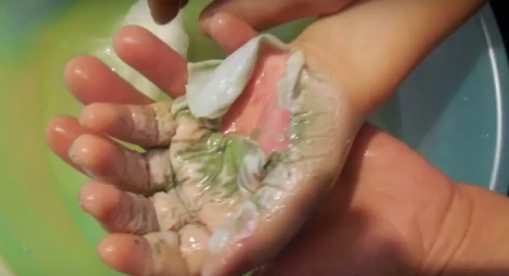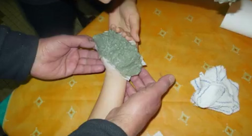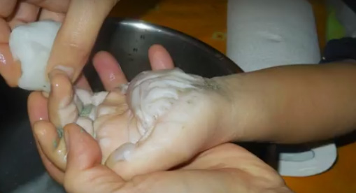 หลังจากที่พ่อแม่ของเด็กได้เจาะน้ำในให้แผลที่พุพองออกหมด ก็ใช้โคลนสีเขียวพอกบาดแผลที่มือลูก จากคลิปวิดีโอจะเห็นได้ว่าผิวหนังฝ่ามือที่พองทั้งมือนั้นค่อยๆหลุดลอกออกทีละน้อย โคลนสีเขียวช่วยรักษาบาดแผลบนฝ่ามือให้ค่อยๆดีขึ้นอย่างน่ามหัศจรรย์!